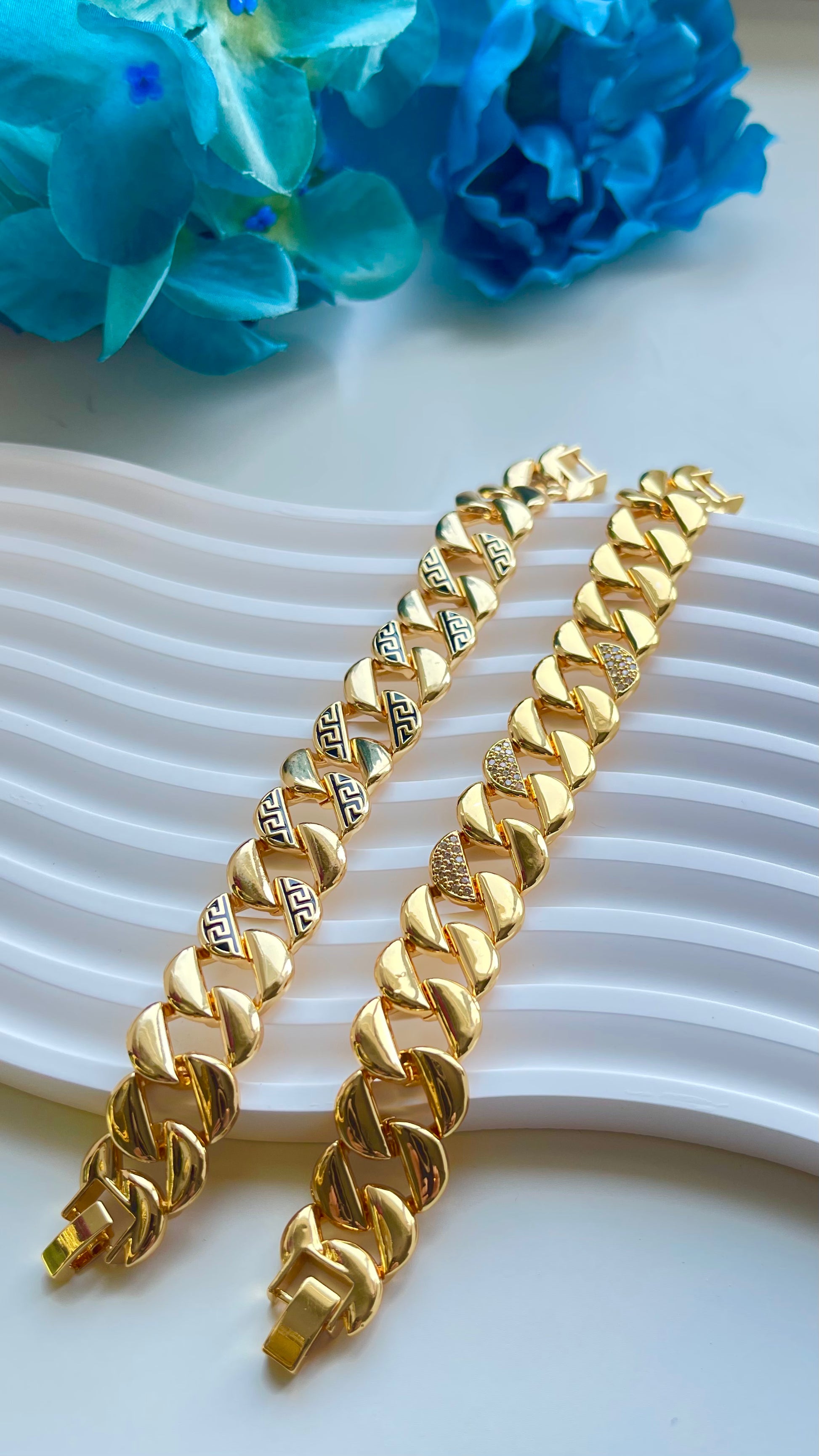 This Chain Bracelet is a finely crafted piece plated in 18k gold atop a resilient brass and copper base. It features distinctive evil eye and Arabic letter pendants, accented with zircon stones.
